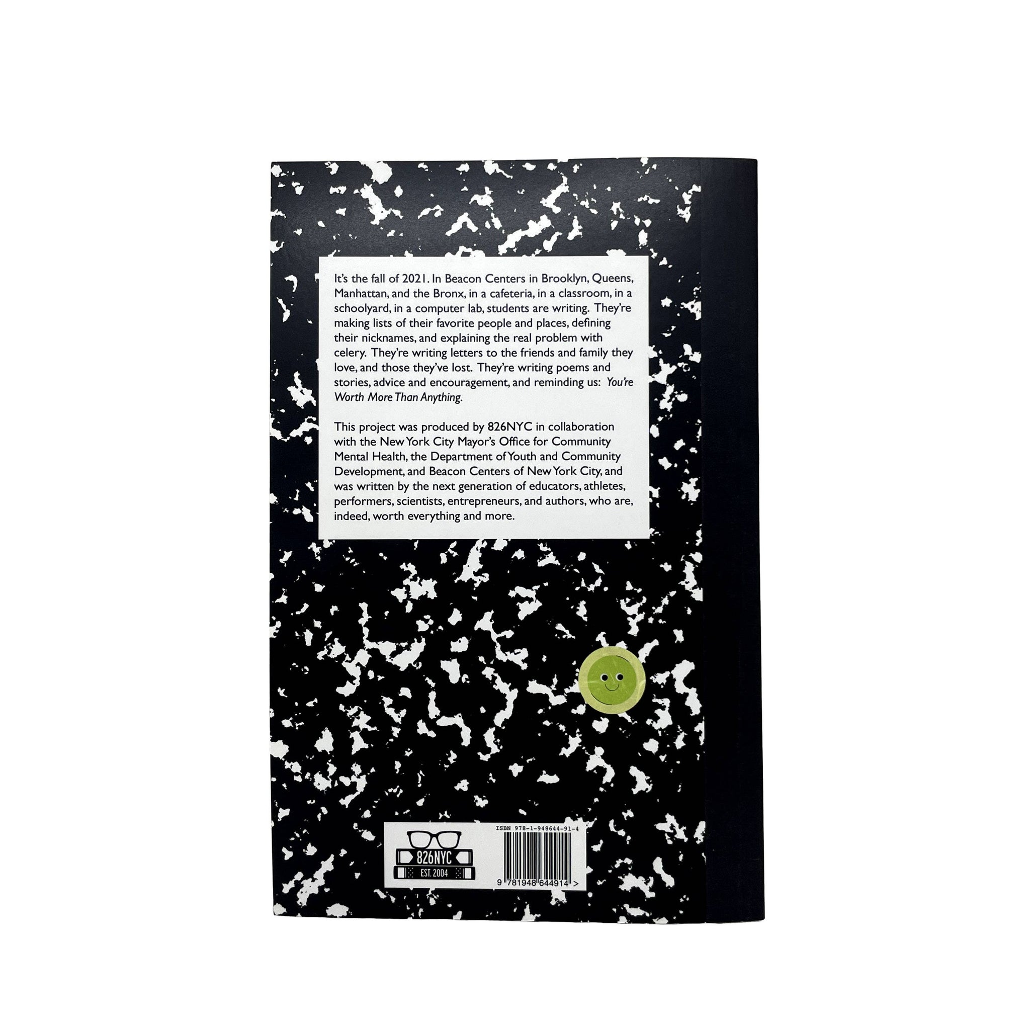 It’s the fall of 2021. In Beacon Centers in Brooklyn, Queens, Manhattan, and the Bronx, in a cafeteria, in a classroom, in a schoolyard, in a computer lab, students are writing. They’re making lists of their favorite people and places, defining their nicknames, and explaining the real problem with celery. They’re writing letters to the friends and family they love, and those they’ve lost. They’re writing poems and stories, advice and encouragement, and reminding us: You’re Worth More Than Anything. This project was produced by 826NYC in collaboration with the New York City Mayor’s Office for Community Mental Health, the Department of Youth and Community Development, and Beacon Centers of New York City, and was written by the next generation of educators, athletes, performers, scientists, entrepreneurs, and authors, who are, indeed, worth everything and more.
