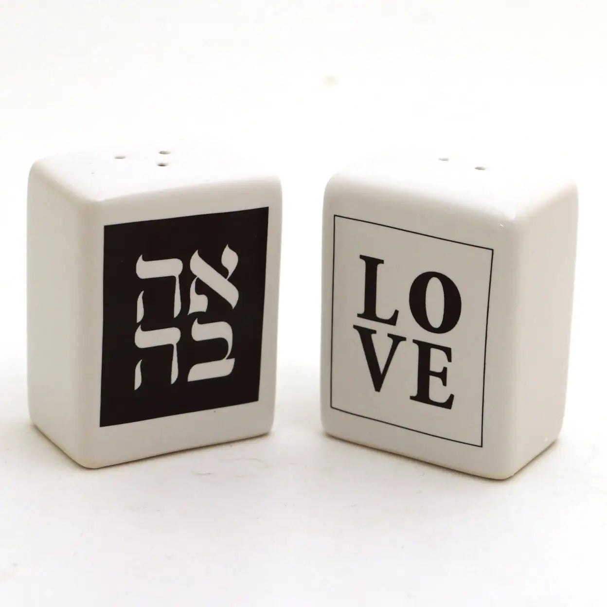 These salt and pepper shakers will make an excellent addition to any table- kosher or not! One shaker reads love, the other has the Hebrew for Ahavah- which means love! These are made from stoneware clay, kiln fired several times to over 1900 degrees- safe to place in the dishwasher. They have a rubber stopper for easy filling.