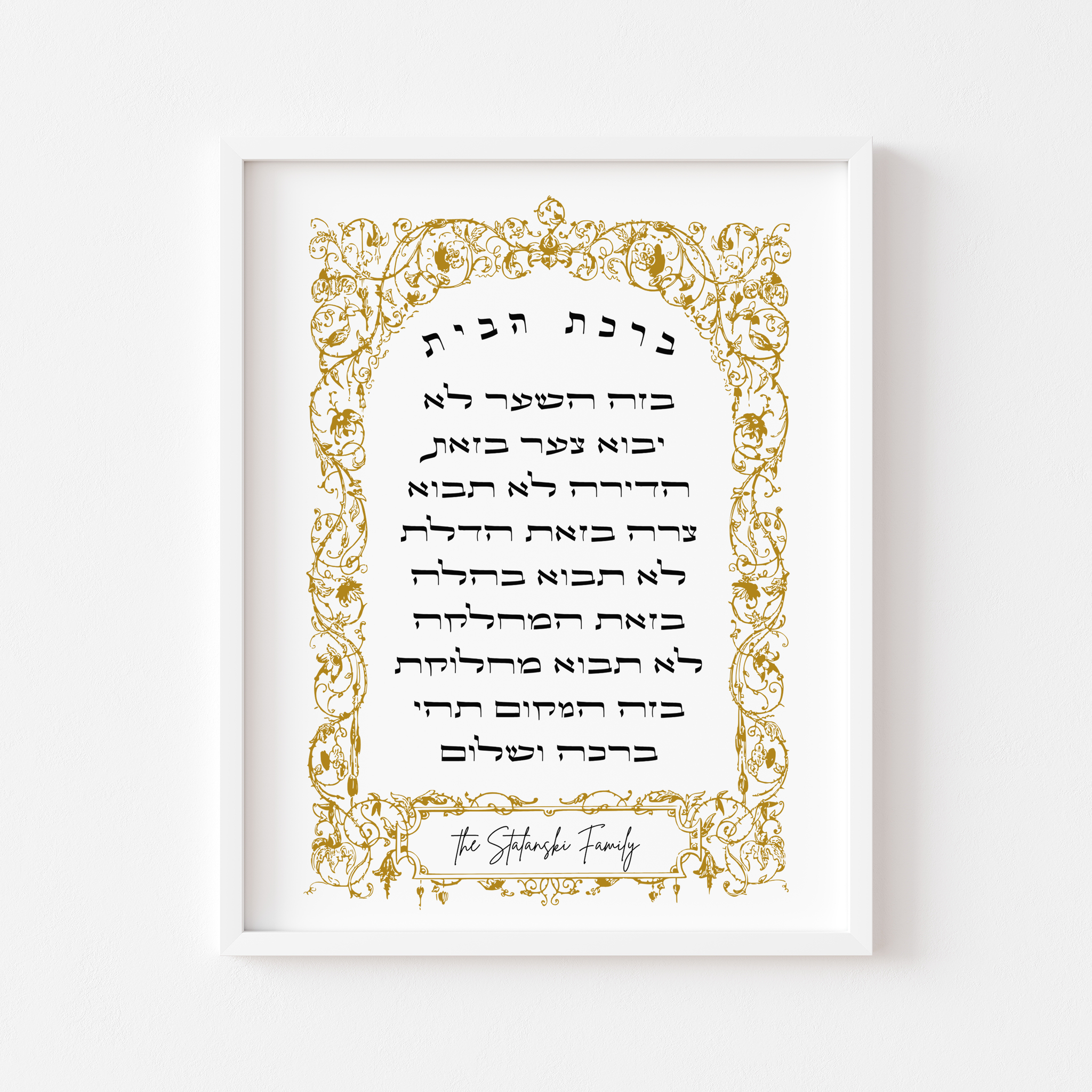 Grace your home with our personalized Birkat Habayit wall art, beautifully framed by an intricate, gold ornate design. Featuring the cherished Hebrew "Blessing for the Home," this elegant print blends timeless tradition with refined aesthetics, perfectly suited for contemporary and classic interiors alike.